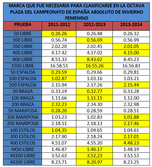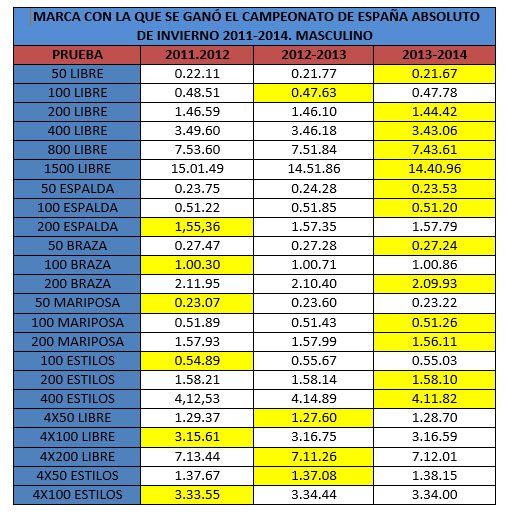 Las dos primeras tablas indican el tiempo que necesitaron los nadador@s y equipos de relevos de clubes participantes, para alzarse con el triunfo en el campeonato nacional absoluto de invierno, en piscina corta y como evolucionaron las marcas desde 2011 hasta 2013.