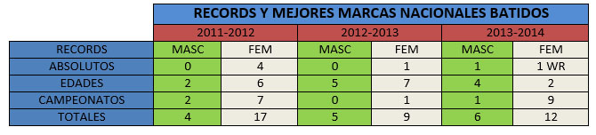 Las pruebas de relevo tuvieron mejores resultados en la segunda de las temporadas, en las que se logró el mejor tiempo en tres de las formaciones. Sin embargo hay seis pruebas que no se ha obtenido mejora alguna desde el nacional de 2011, cuatro de ellas individuales-200 espalda, 100 braza, 50 mariposa y 100 estilos- y dos por escuadras. Destacan también las nueve nuevas plusmarcas absolutas en los eventos del 2012 y 2013.