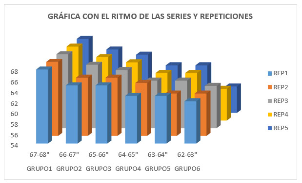 La parte principal consistía en 6 bloques de 5 repeticiones de 100 metros, aumentando progresivamente la velocidad y el descanso en cada uno de los grupos y con 3’ de recuperación entre ellos. El ritmo de las repeticiones de cada grupo se expresa en la tabla adjunta, siendo la marca superior el primer objetivo. La repeticiones eran cronometradas por un compañero