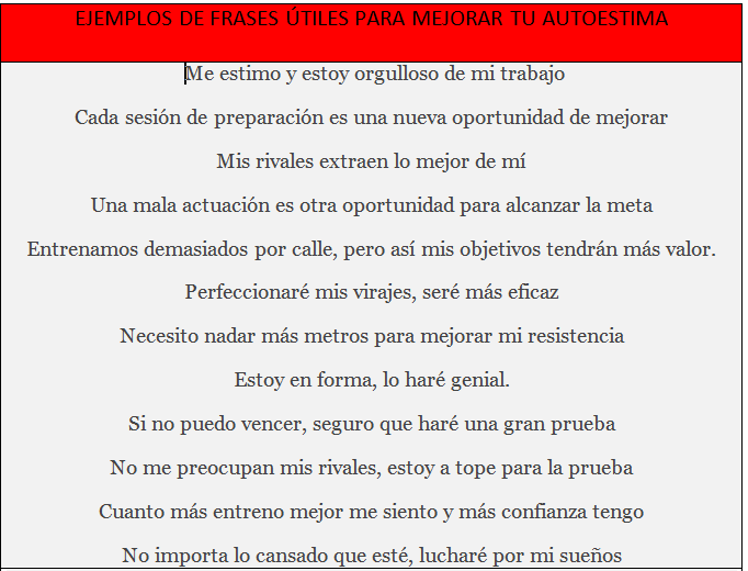 Algunas frases que expongo a continuación podrían ser un buen ejemplo de ello y en determinados casos pueden tener un componente importante de autoafirmación y de capacidad o aptitud. Pueden hacer referencia a tus rivales, impulsar tu seguridad y confianza, mejorar tu autoestima y estimular incluso la recuperación de posibles lesiones.