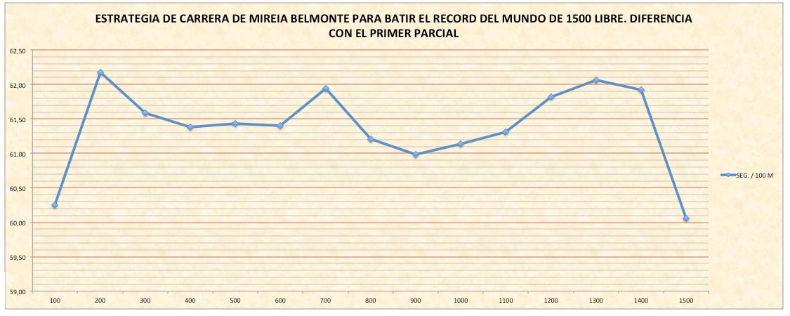 - Mireia Belmonte utilizó un planteamiento de ritmo uniforme durante la práctica totalidad de la prueba y terminó con una velocidad mayor en los últimos 50 metros finales, en los que aceleró considerablemente. La estrategia le sirvió para batir el record mundial de 1500 libre, con un registro final de 15.19.71. La marca anterior estaba en poder de Lauren Boyle con 15.22.68, casi 3” más que la nueva plusmarquista.