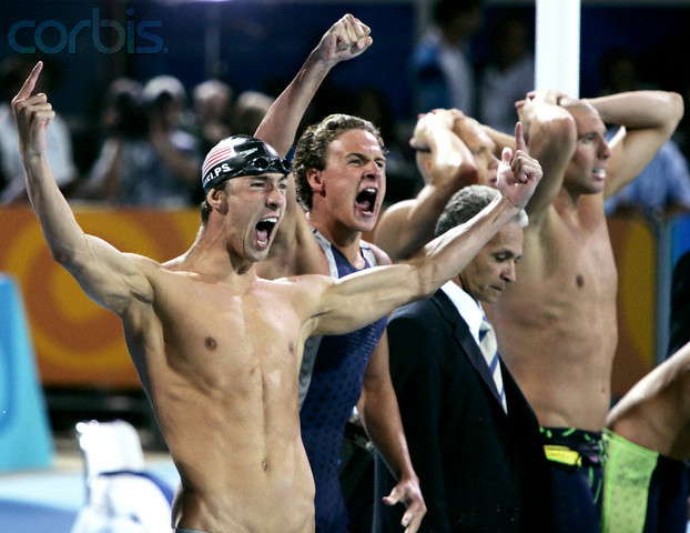 17 Aug 2004, Athens, Attica, Greece --- Michael Phelps (L) and Ryan Lochte (2ndL) of the U.S. celebrate their gold medal in the men's 4x200 freestyle relay while Australia's Grant Hackett (R) and an unidentified team-mate react behind them at the Athens 2004 Olympic Games August 17, 2004. --- Image by © Jerry Lampen/Reuters/Corbis