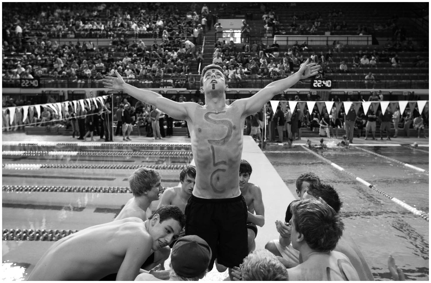 Aymes Hass, capitán del equipo de natación de Southlake Carroll High School, realiza un ritual para impulsar la actuación de sus compeñeros y equipo antes del inicio del Campeonato del Estado de Texas en el Centro de Natación Jamail Texas (19 de febrero de 2011)