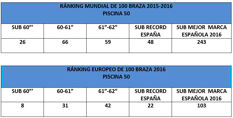 En la última temporada 2016-2017 la mejor marca de un nadador español es de 1.02.29, de Guillermo Blanco Benedicto, a más de dos segundos y medio de la marca de referencia, lo que en mi opinión dice mucho de nuestro nivel y debería estimular nuestra ambición de forjar nuevos especialistas.