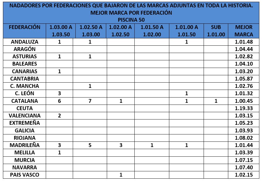 *La tabla indica el número de nadadores de cada federación que mejoraron en al menos una ocasión los tiempos expuestos, así como el mejor tiempo histórico de 100 braza