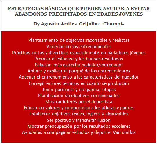 • La falta de apoyo hacia los nadadores cuando las metas se tuercen, en el instante que más lo necesitan, sin valorar como debiera el motivo, lesiones, mal rendimiento, mesetas, etc. Es el momento en el que el nadador percibe que ya no le importas y que la mejor solución es dejarlo.