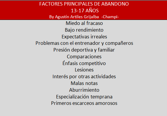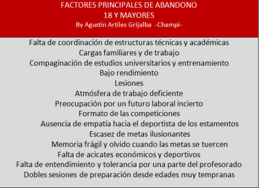 • Por Conformismo de los nadadores, que piensan que a cierta edad lo mejor es retirarse y dar entrada a nuevas generaciones. Porque no son conscientes también muchas veces del compromiso y la responsabilidad que conlleva el deporte en general y el ARD en particular y admitir que deporte y  estudios en la mayoría de los casos pueden ir de la mano, valores que de alguna manera dirigen nuestras vidas y contribuirán a que logren los objetivos.