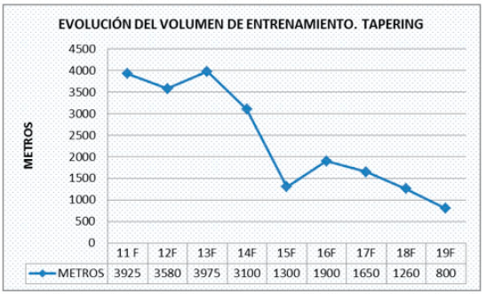 En la siguiente gráfica se expone el volumen de metros realizados en los últimos 9 días antes del campeonato, correspondiente a la fase de puesta punto