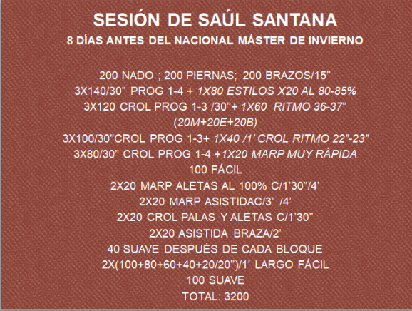 - Entrenamientos personales con un volumen aproximado de de 3000-3500 metros semanales en el caso de Saúl Santana, y de 4000-4500 en el de Ricardo Salcedo, adaptado e individualizado a sus características personales y específicas.