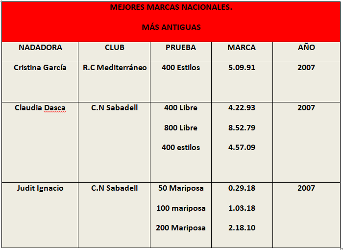 - Cristina García (1) , Claudia Dasca (3) y Judit Ignacio(3) , como indico en la tabla adjunta son las tres andadoras que poseen en la actualidad las MMN más antiguas de la tabla, que datan del 2007