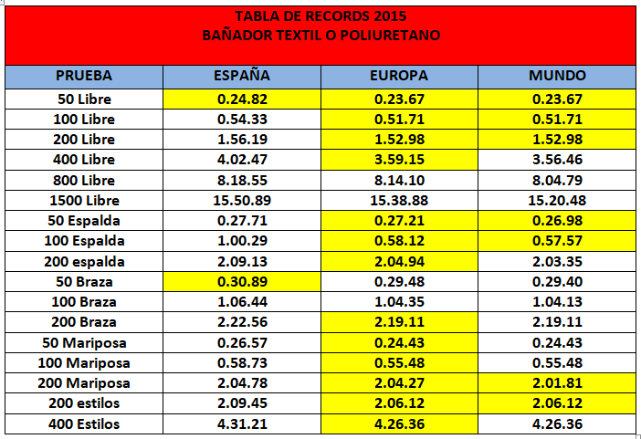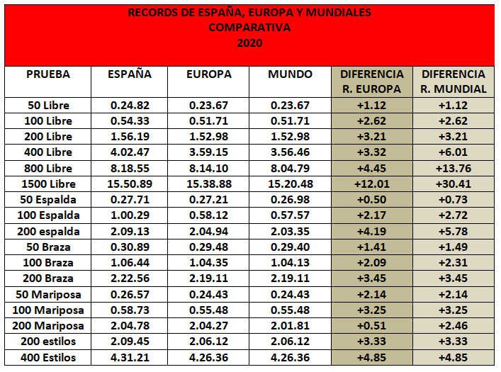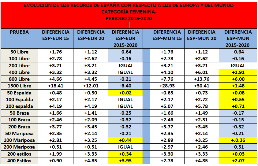 - Teniendo en cuenta los datos obtenidos en 2015, en otro estudio que hice entonces, ver cómo han evolucionado en este aspecto los records nacionales absolutos de nuestras nadadoras, en el periodo 2015-2020, con respecto a las plusmarcas europeas y mundiales. Comprobar en cuáles estamos más cerca y en cuales nos hemos alejado
