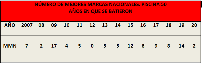 - En 2019 fueron batidos 4 records (50 Libre, 100 Libre, 50 Mariposa y 50 Braza)