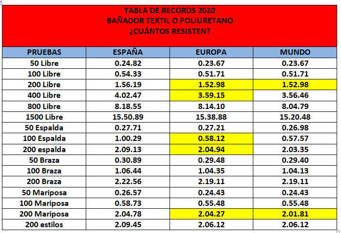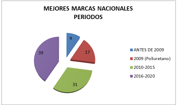 - De 96 mejores marcas nacionales posibles, tan solo 17 de ellas corresponden a 2009, año de los bañadores de poliuretano, lo que representa un 17.70% del total de plusmarcas, mientras que 79 de ellas (82.29%) fueron logrados con bañador textil.