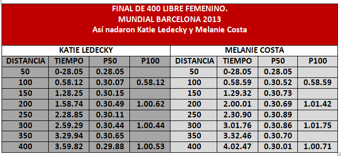 - Katie Ledecky utilizó un planteamiento de ritmo uniforme durante toda la prueba con un parcial de 58.12 segundos en el primer cien y fragmentos similares de 60” cada uno de ellos en los siguientes 300. Melanie Costa nadó los primeros 100 metros en un tiempo de 0.58.59 y los siguientes segmentos de la distancia los realizó a 2.85 y 3.16 segundos más lentos que el primero de ellos, terminando el último tramo en 1.00.71, más rápida.