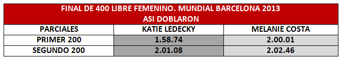 - Su marca en el primer 200 de la prueba fue de 2.00.01 y el segundo de 2.02.46 lo que supuso una diferencia de 2.48 segundos entre ambos. Su velocidad promedio en la distancia fue de 1.64 m/seg, por 1.66 m/seg de la nadadora americana