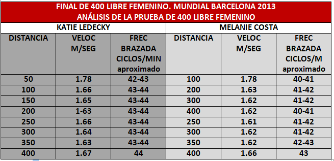 - El análisis de la carrera indica que la nadadora del C.N La Salle Balear nadó los primeros 100 metros a 3.44 segundos de su mejor marca personal en esta distancia en línea (0.55.15). Los 200 a 3.82 por encima de su registro más rápido en la distancia (1.56.19) y la marca final de 4.02.47 fue 4.28 segundos mejor que su mejor crono anterior de 4.06.75, nuevo record nacional absoluto, con una frecuencia de brazada aproximada de 41-42 ciclos/min, por los 43-44 de Katie Ledecky, según extraigo de una grabación de la prueba por televisión.