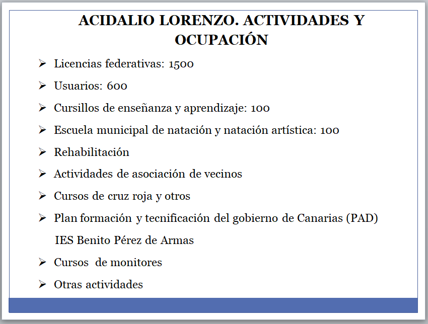 Acidalio Lorenzo es mucho más que una piscina a donde acuden a diario los chicos e incondicionales de la natación (Junto a la gimnasia y el atletismo, el deporte más importante de los Juegos olímpicos), es un sentimiento. ES EL HOGAR DE TODOS ELLOS, más de 2500 usuarios y deportistas que acuden a la instalación para practicar su actividad favorita y que en la mayoría de los casos da sentido a sus vidas
