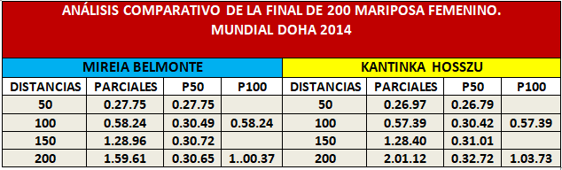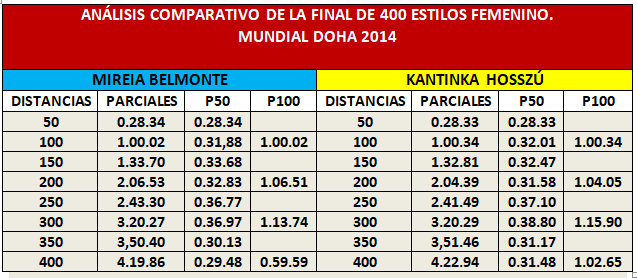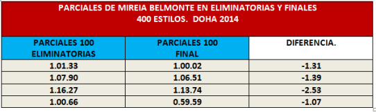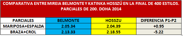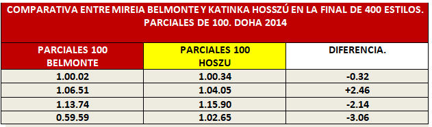 - La victoria de la prueba de 200 Mariposa con plusmarca mundial incluida le dio alas a Mireia para afrontar la final de 400 estilos. La nadadora húngara realizó un gran desgaste, que se observa especialmente en el último parcial de 50 de esta prueba, con una diferencia de 2.07 segundos, a favor de la española.