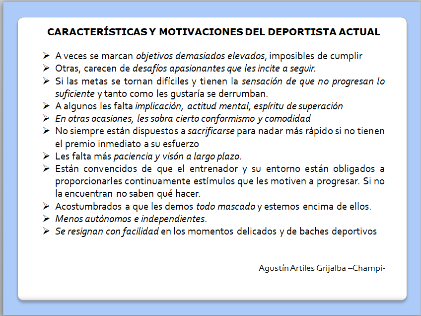 En esta panorama actual, los técnicos no debemos ser ajenos a ello y tenemos la opción y la responsabilidad de implicarnos en conocer cómo actúan y piensan los deportistas de hoy en día, reconocer las fortalezas y fragilidades, la calidad de su carácter, vigor y empuje y animarles y exigirles a potenciar la habilidad de adaptarse a los contratiempos.