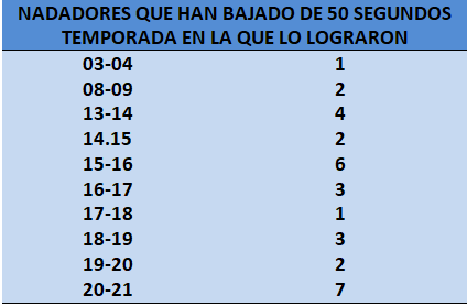 Cuatro de estas marcas se lograron en el periodo 2013-2014, también por cuatro atletas distintos. Tres de ellas fueron conseguidas en 2014. Sin duda una gran progresión, que nos permitió de paso disponer de un relevo 4×100 libre competitivo, a nivel europeo. En el año 2015 se produjo un estancamiento y tan solo un nadador español, Markel Alberdi, bajó en 2 ocasiones de la barrera de los 50 segundos. En la campaña 2015-2016 nada menos que seis nadadores bajaron el tope en algún momento y no ha sido hasta la temporada actual, 2020-2021, cuando la prueba recupera cifras tan destacadas, e incluso da muestras de haber despegado.