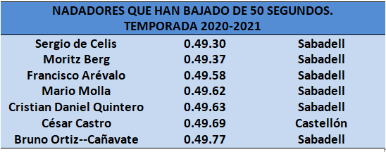 Una situación extraordinaria, no tan solo por la importancia de la marca en sí y del número de chicos que lo han conseguido, sino también por las buenas sensaciones que nos deja. Solo llevamos siete meses de temporada y por si no fuera suficiente, otros dos nadadores jóvenes, Luís Domínguez (2003) con 0.50.00 y Víctor Marín (2002) con 0.50.02 se han quedado a las puertas también de conseguirlo, lo que indica el buen momento que vivimos y eleva a 15, los nadadores que en al menos una ocasión han bajado la barrera de los 50 segundos en toda la historia, en un panorama tan difícil y de tanta incertidumbre como el actual, marcado por el confinamiento, la suspensión de entrenamientos y competiciones y el aplazamiento de los Juegos olímpicos.