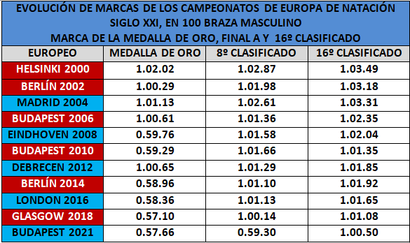 *Evolución de las marcas logradas por los campeones de Europa en la prueba de 100 braza masculino. Tiempo que necesitó el 8º clasificado para nadar la final A y registro obtenido por el 16º clasificado en todos los campeonatos continentales, celebrados entre 2000-2021.