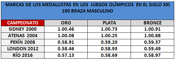 - Si en el año 2008 60 nadadores europeos nadaron en la horquilla 59”-1’01”, en 2012 ya eran 77 los que lo hicieron y en 2016, nada menos que 127, además de Adam Peaty que lo hizo en 0.57”.