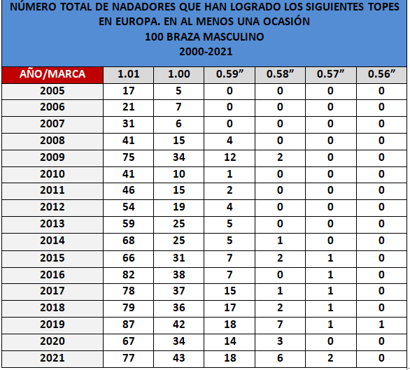 - En 2021, en tan solo 5 meses 143 nadadores ya han hecho al menos una vez un tiempo entre 59”-1’01″; seis en 0.58” y de nuevo Peaty en 57”