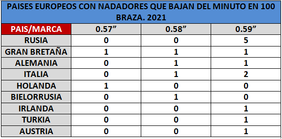 9 países de Europa tienen algún nadador que ha nadado en 2021 por debajo de la barrea del minuto, distribuidos de la siguiente manera.