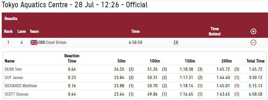 Hoy en Tokio la historia se ha repetido, en el mejor escenario posible. Duncan Scott, junto a Tom Deam, James Guy y Mathew Richards ha llevado a Gran Bretaña a lo más alto del podio olímpico, batiendo el Récord de Europa con 6.58.58 y realizando la mejor posta de todos los participantes con unos increíbles 1.43.45, lo que demuestra su enorme talento en las pruebas de relevos.