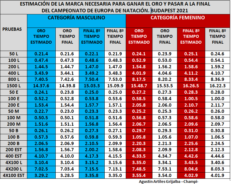 En la víspera del campeonato de Europa de natación de Budapest 2021 publiqué una tabla con la idea de acercarme al tiempo que en mi opinión sería necesario para