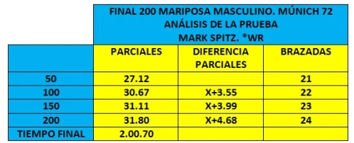 - Si observamos las pruebas de mariposa de Múnich 72 nos damos cuenta que Mark Spitz no efectuó ni tan siquiera un solo batido en la salida y virajes. Ejecutó la salida, e inmediatamente se puso a nadar, algo impensable en la actualidad, con la revolución del batido subacuático