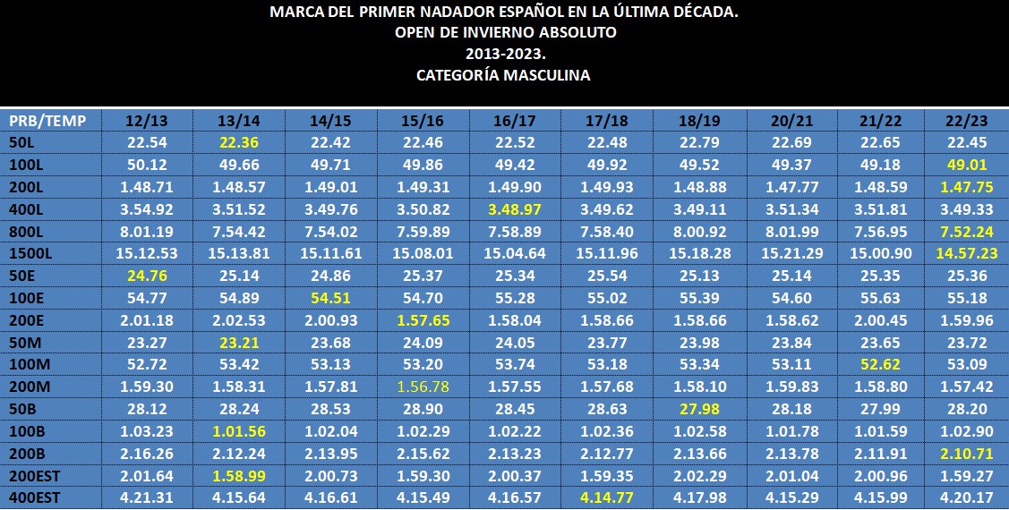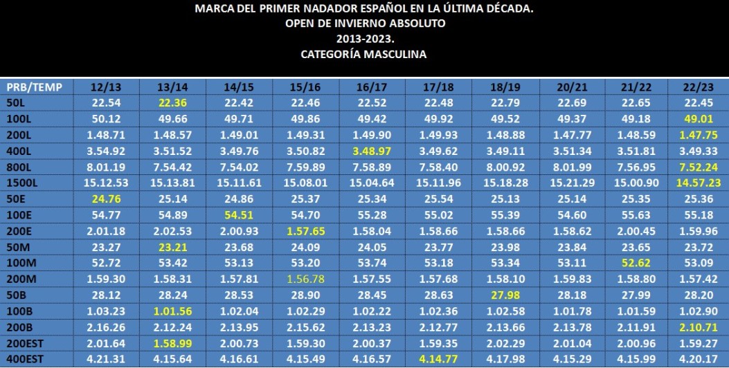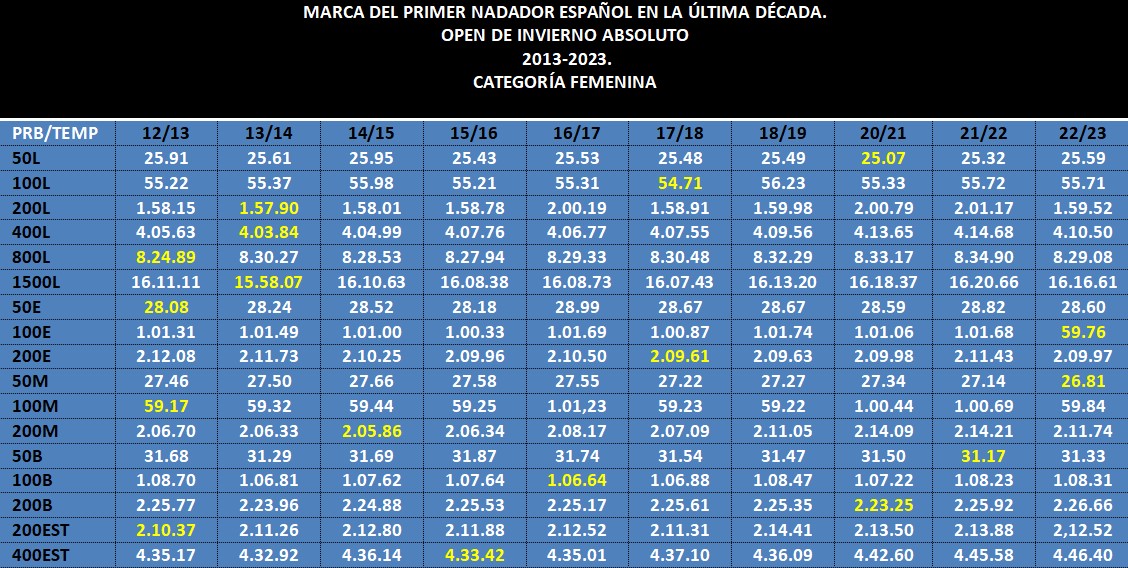 MARCA DEL PRIMER CLASIFICADO EN EL CAMPEONATO DE ESPAÑA “OPEN” DE NATACIÓN ABSOLUTO, EN LA ÚLTIMA DÉCADA