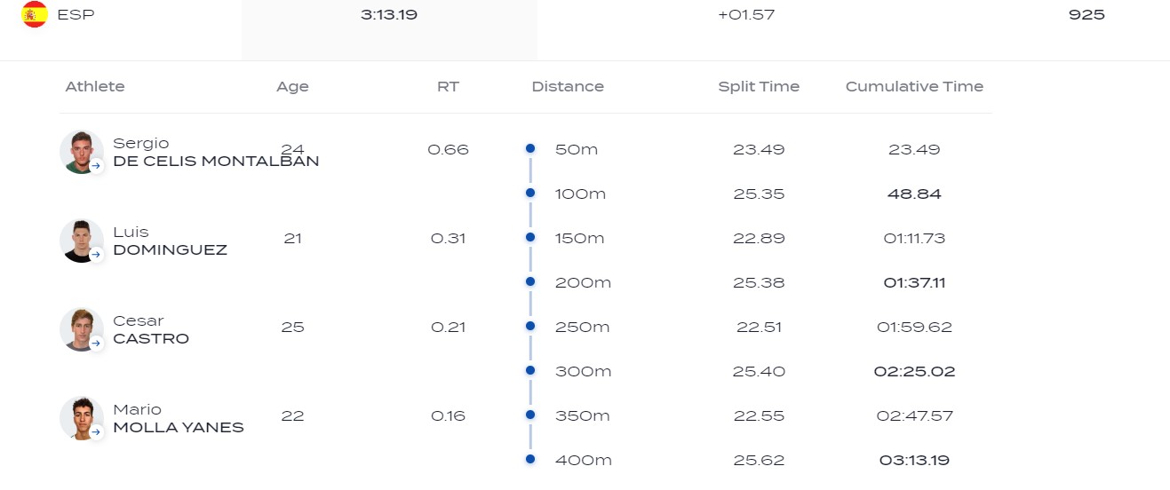 Sergio de Celis, 48.84. Luís Domínguez, 48.27. César Castro, 47.91 y Mario Mollá, 48.17 se quedaron a tan solo 4 centésimas de meterse en la final olímpica de 4×100 Libre, en una extraordinaria prueba en la que lograron batir el récord de España absoluto con un tiempo de 3.13.19, que destroza la anterior plusmarca de 3.13.79 en 54 centésimas.